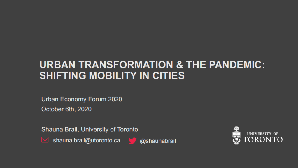 Urban Transformation & The Pandemic: Shifting Mobility in Cities https://shaunabrail.com/wp-content/uploads/2020/10/urban-economy-forum-2020-3.pdf